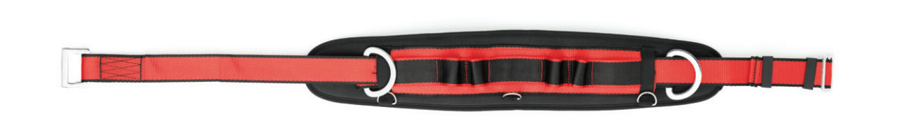 Extra wide cushioned back pad for lumbar support. 2 Lateral D-rings for work positioning. Metal rings for tools,bolt bags etc.
